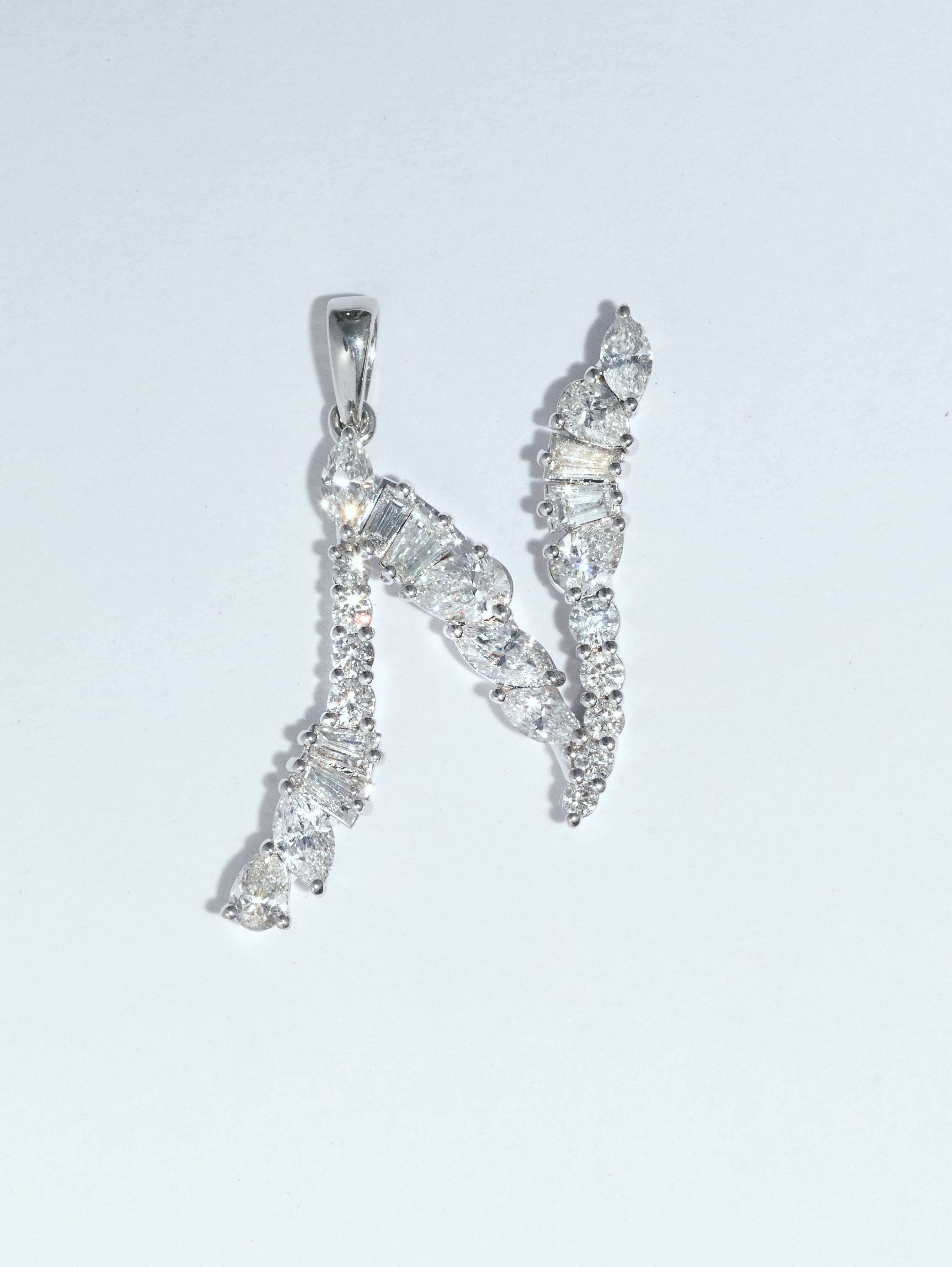 Wear your N initial or commemorate someone special with this initial charm. The N initial is handcrafted in 14-karat gold and set with mixed cut diamonds, made to be worn in your own way with any chain to tell your story. The image shows the initial in white gold but the piece can be made in yellow and rose gold.
