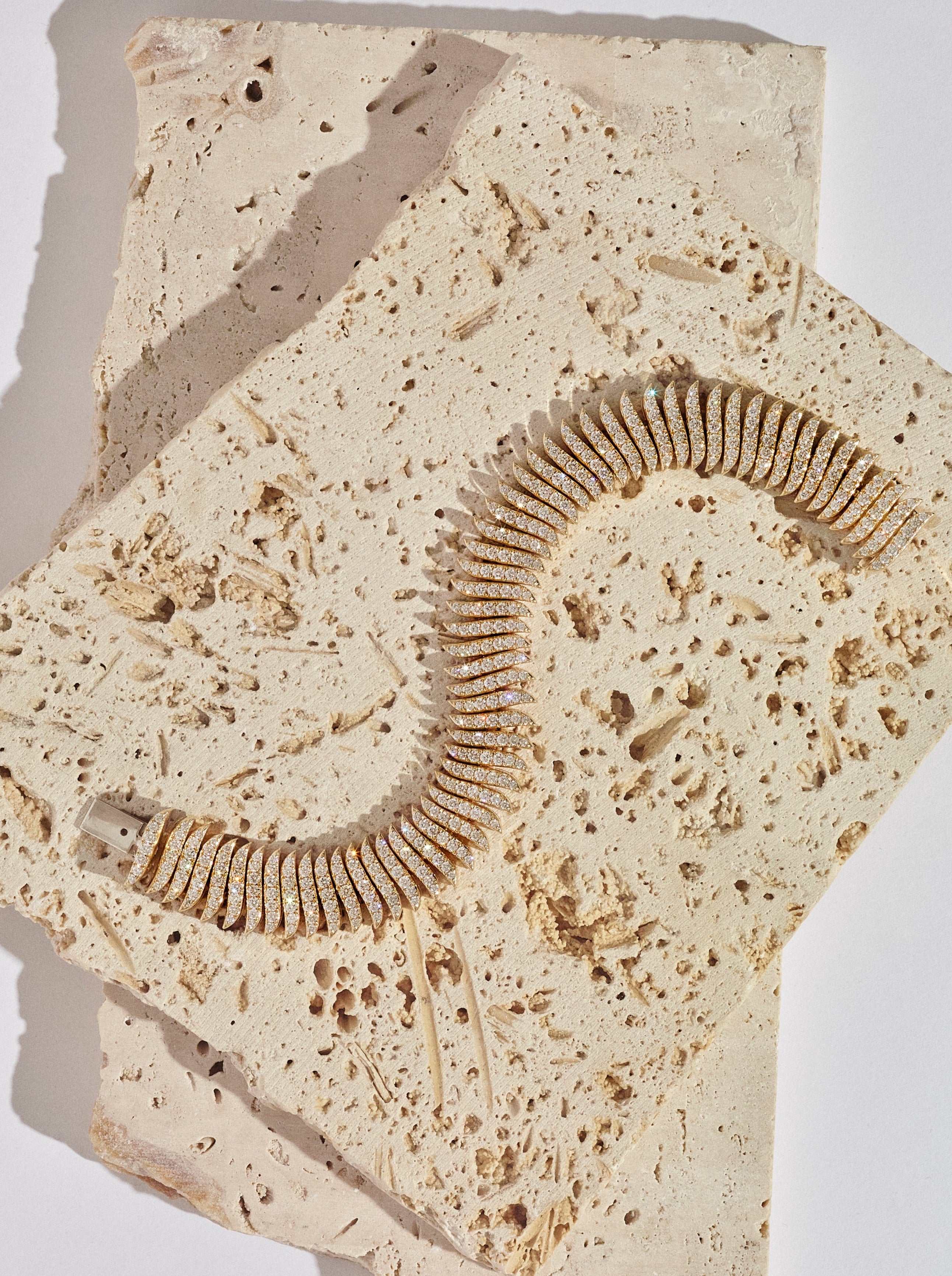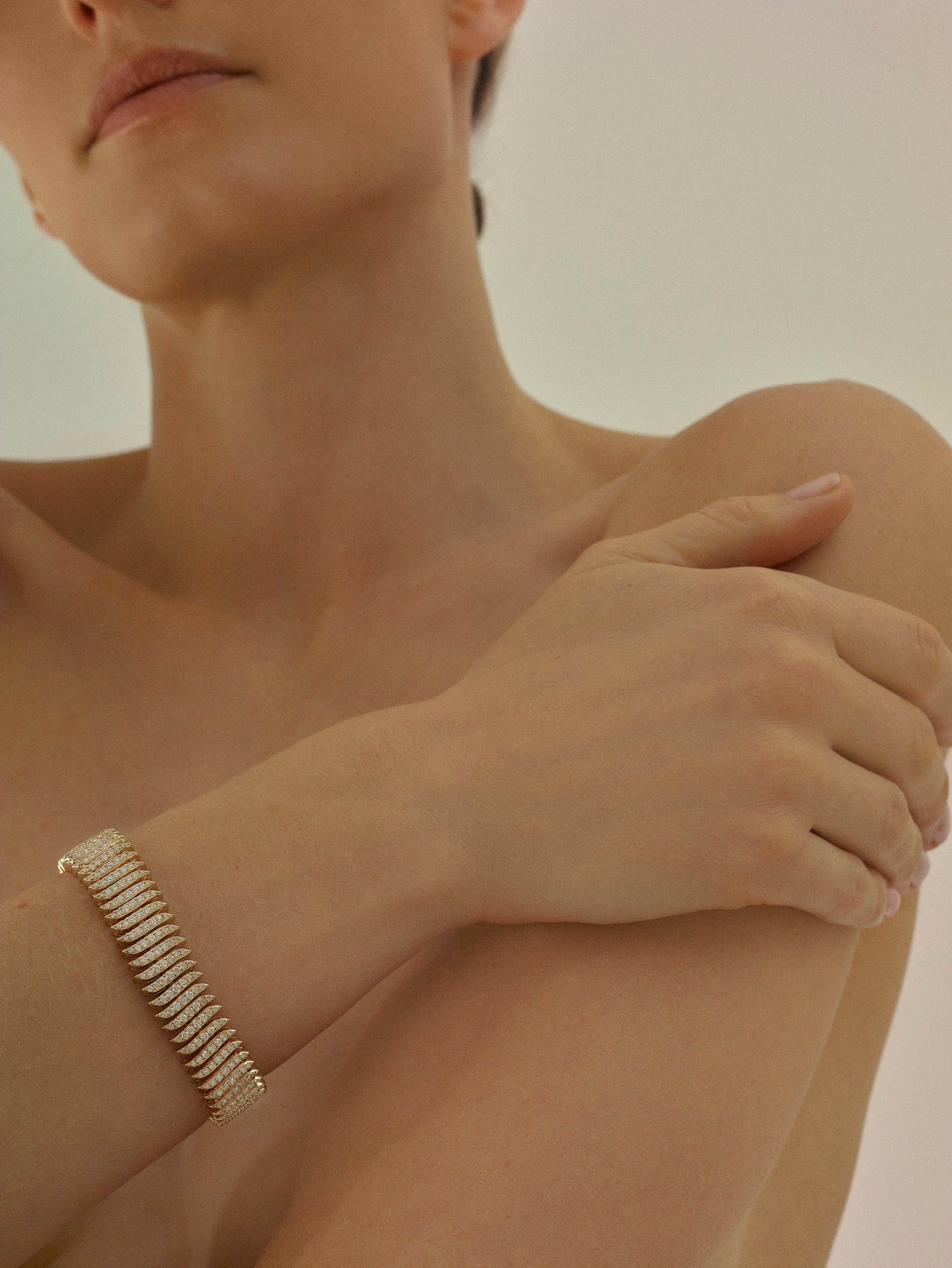 The Stephanie collection reflects our love affair with weighty links. Using nature as our muse, this collection is made up of fluid silhouettes meticulously crafted to move with your skin. This hand-made Stephanie bracelet has a total of 50 grams of 14-karat gold and is mounted with 6.85 cts of F/VS diamonds. The images show the bracelet in yellow gold, however, the piece can be made in white and rose gold.