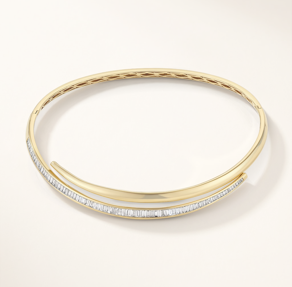 This is an elegant and contemporary open-collar, crafted from polished 18-karat gold. One side of this opening is a smooth, gleaming band of gold; the other side is a gracefully curved, slightly narrower band that is entirely illuminated by a continuous line of channel-set baguette-cut diamonds totaling 6.75 cts. These elongated, rectangular diamonds are meticulously aligned side-by-side, creating a brilliant, uninterrupted strip of sparkle. The images show the design in yellow gold, however, it can be made in white and rose gold.