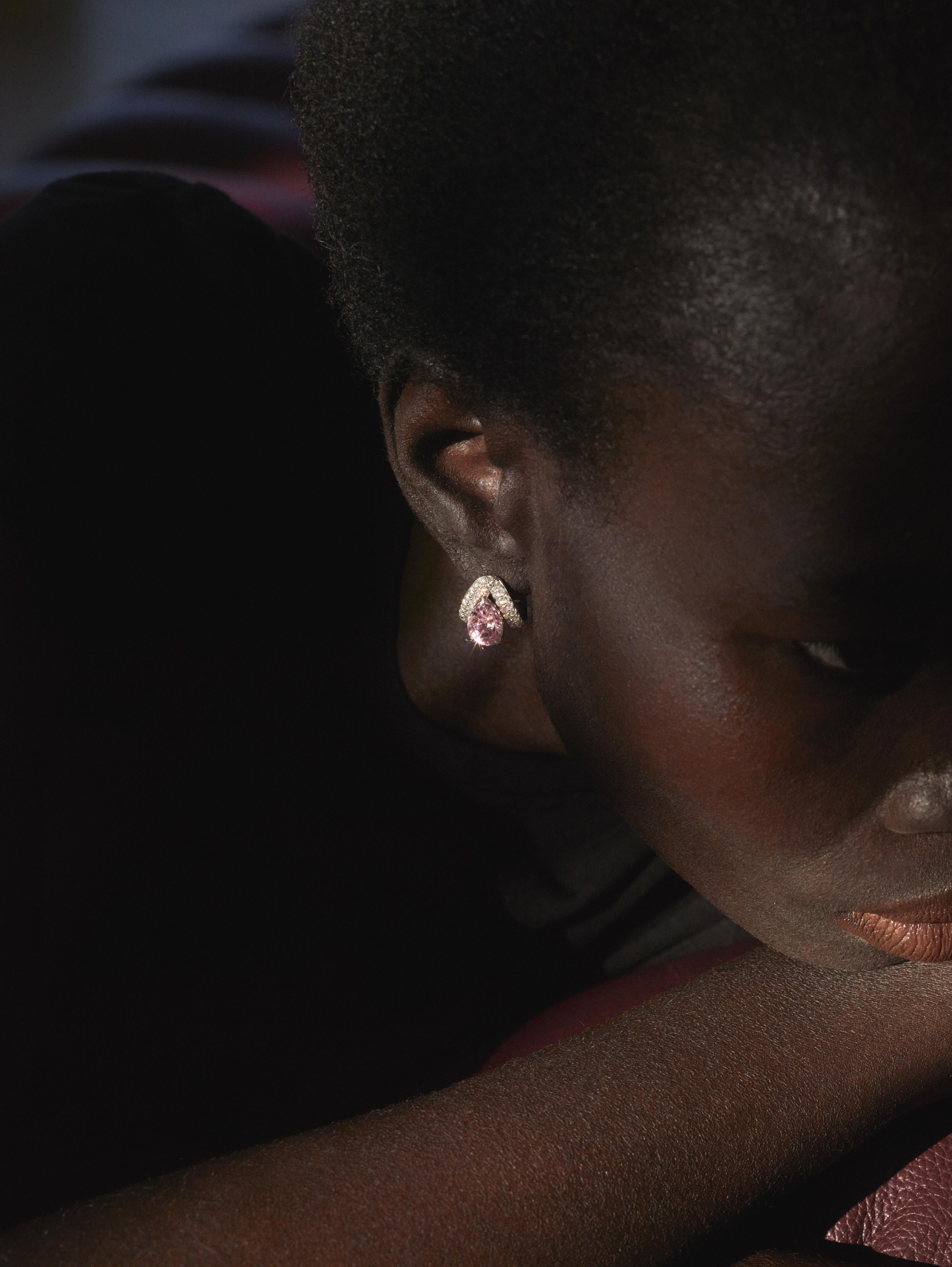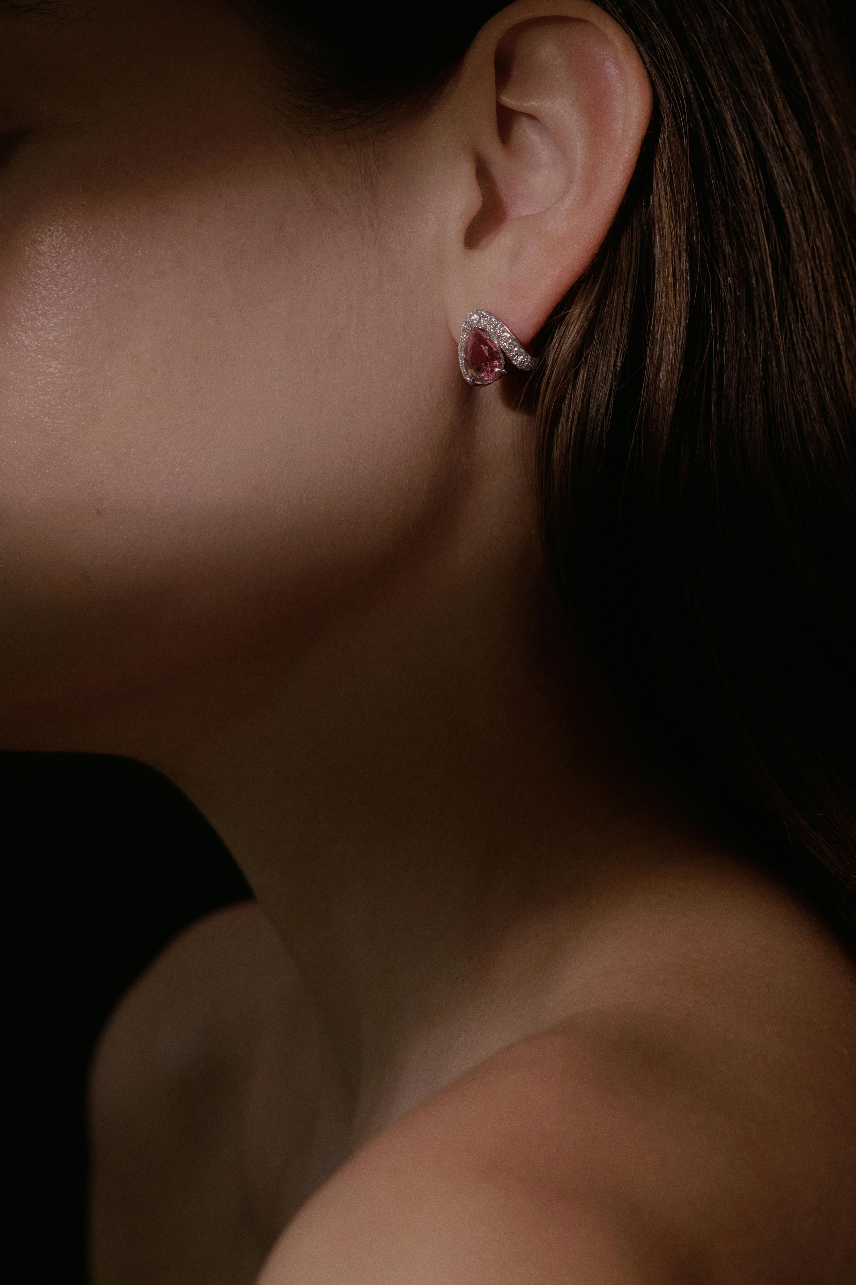 A sculptural masterpiece for the ear. This one-of-a-kind earring features a mesmerizing 2.75 carat pear-cut pink tourmaline, gracefully embraced by a sweep of brilliant pavé diamonds. Crafted in 14-karat gold, the piece is illuminated by 0.63 carats of dazzling EF/VS quality diamonds, creating a fluid, wave of sparkle.