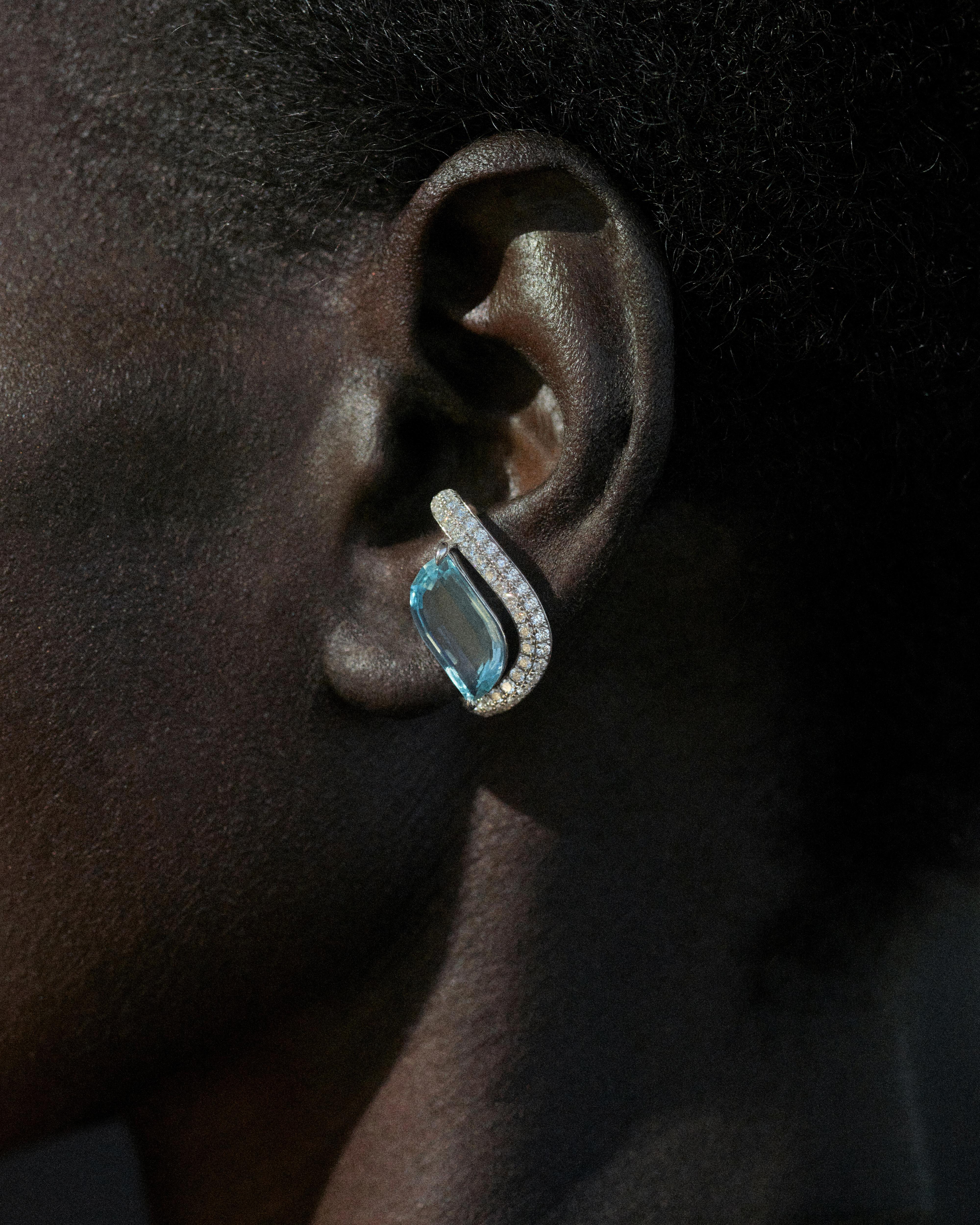 A sculptural masterpiece for the ear. This one-of-a-kind earring features a mesmerizing 3.35 carat leaf-cut Aquamarine, gracefully embraced by a sweep of brilliant pavé diamonds. Crafted in 14-karat gold, the piece is illuminated by 0.80 carats of dazzling EF/VS quality diamonds, creating a fluid, wave of sparkle.