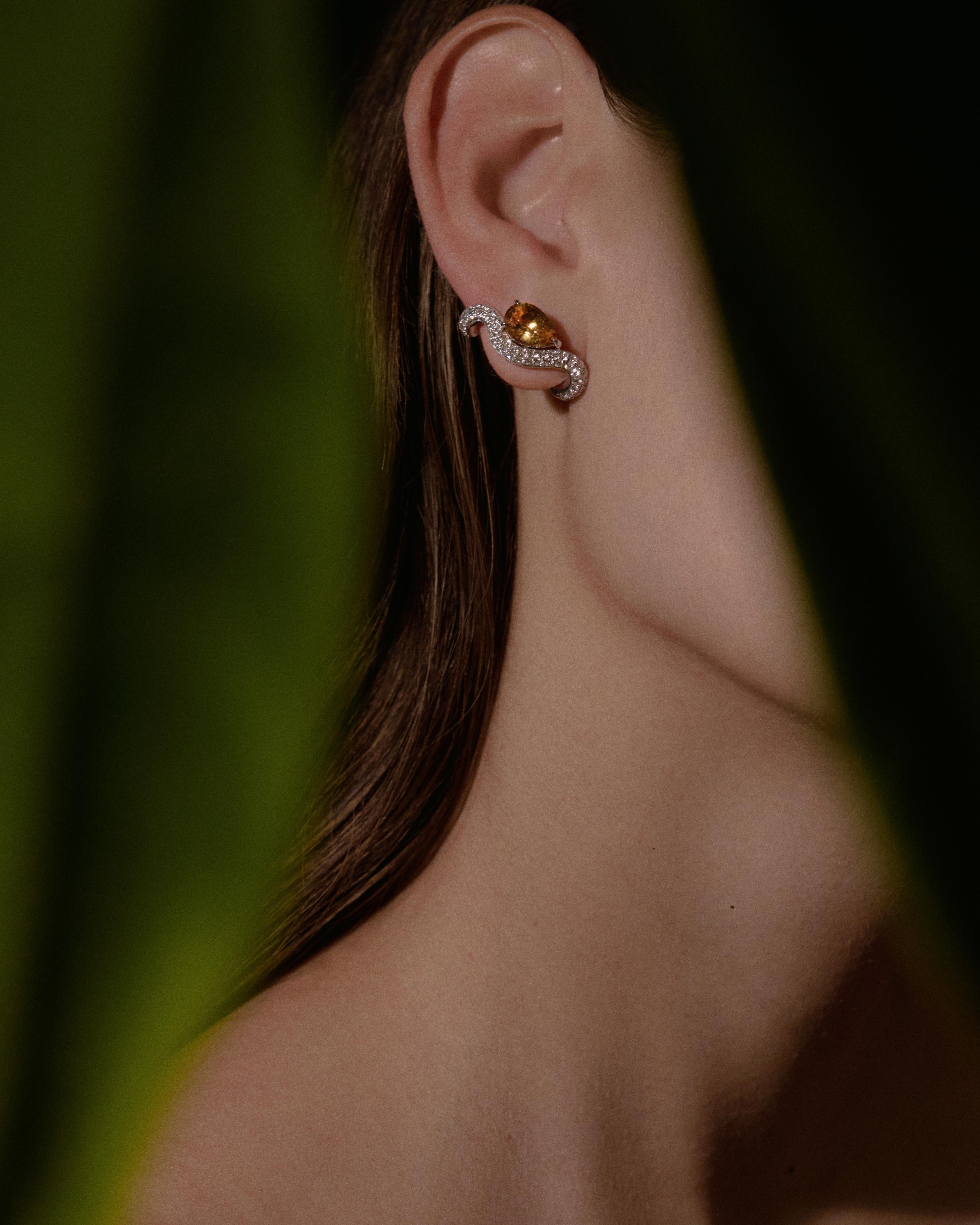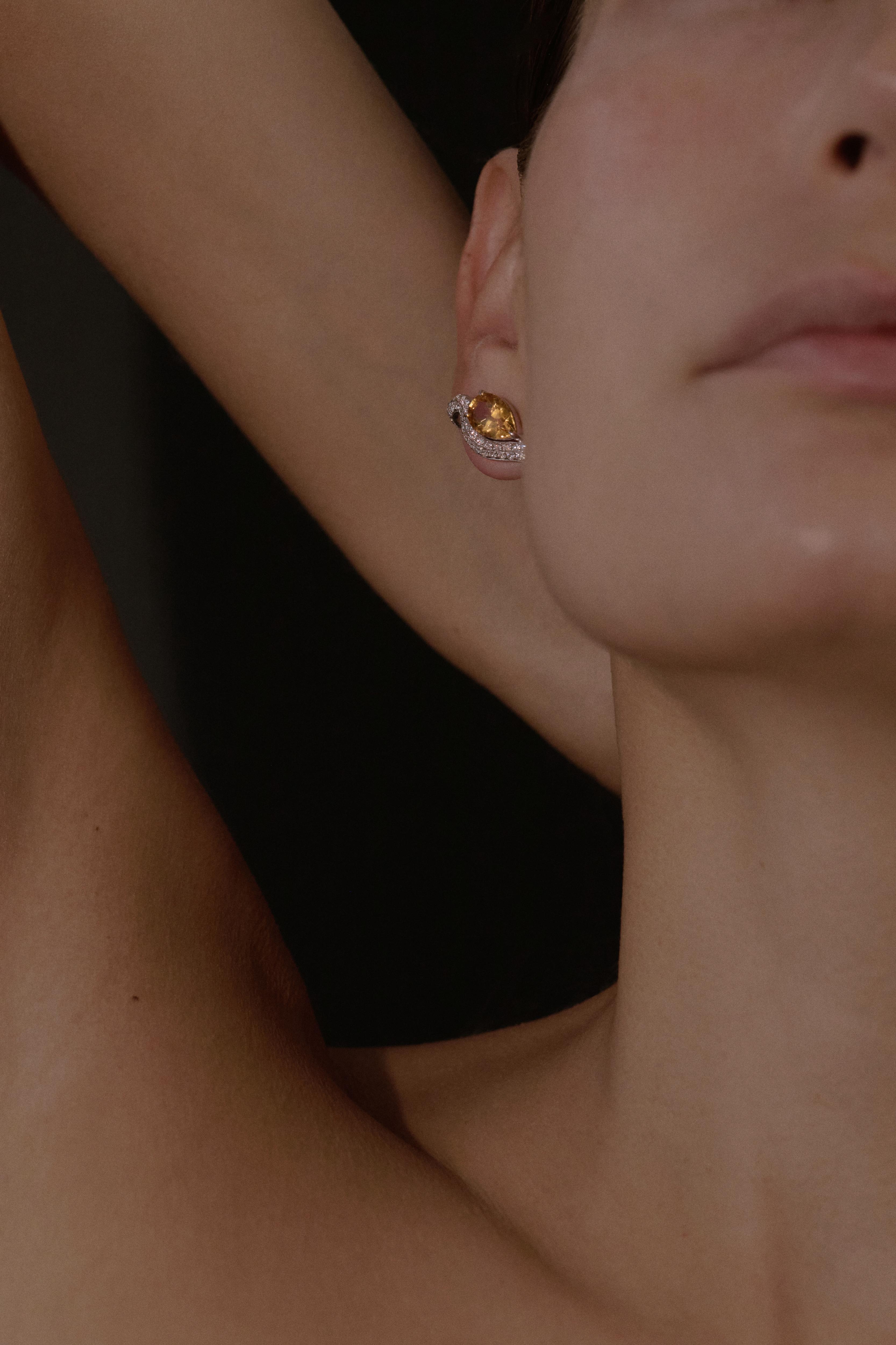 A sculptural masterpiece for the ear. This one-of-a-kind earring features a mesmerizing 2.47 carat pear-cut imperial topaz, gracefully embraced by a sweep of brilliant pavé diamonds. Crafted in 14-karat gold, the piece is illuminated by 0.81 carats of dazzling EF/VS quality diamonds, creating a fluid, wave of sparkle.
