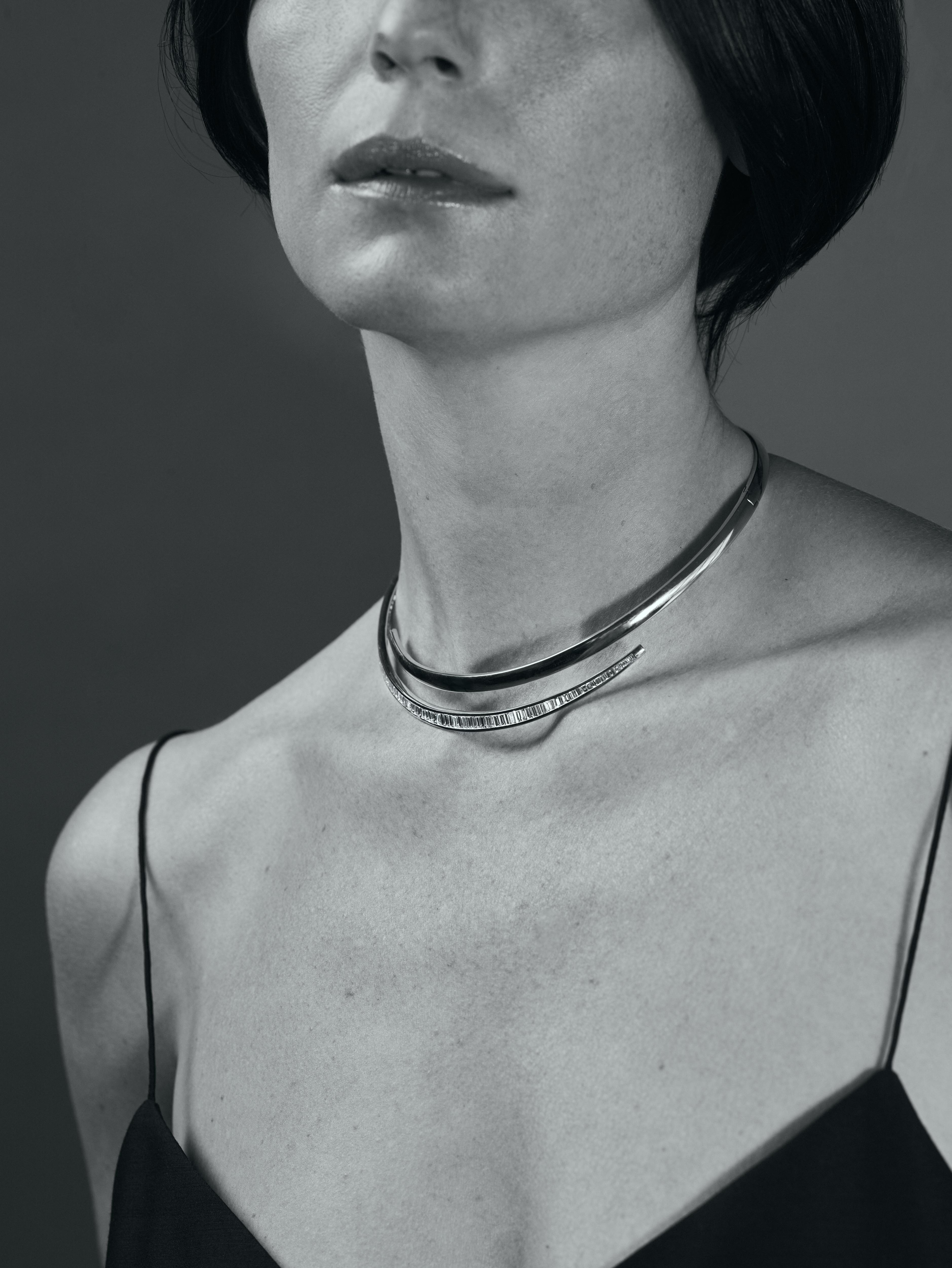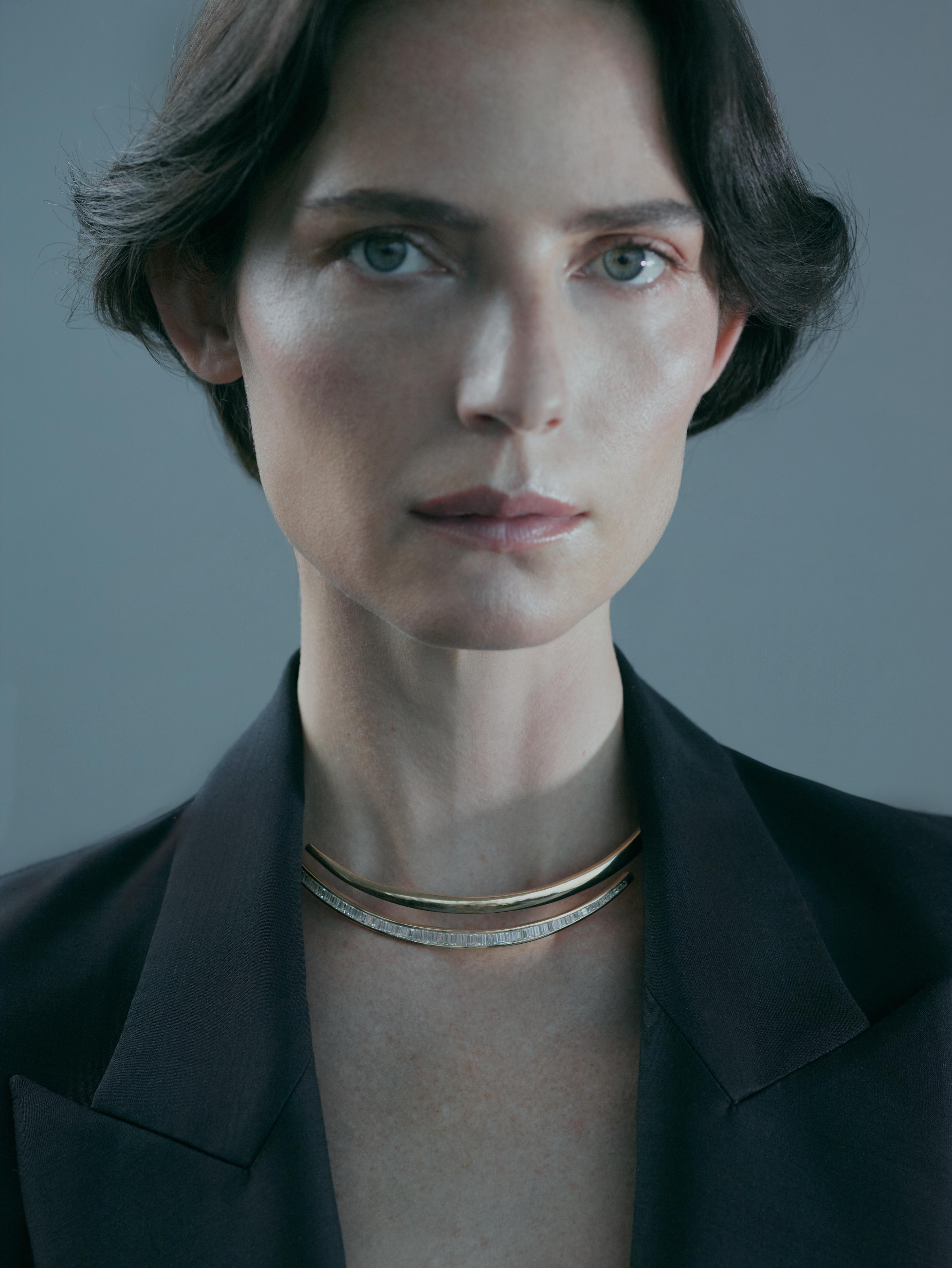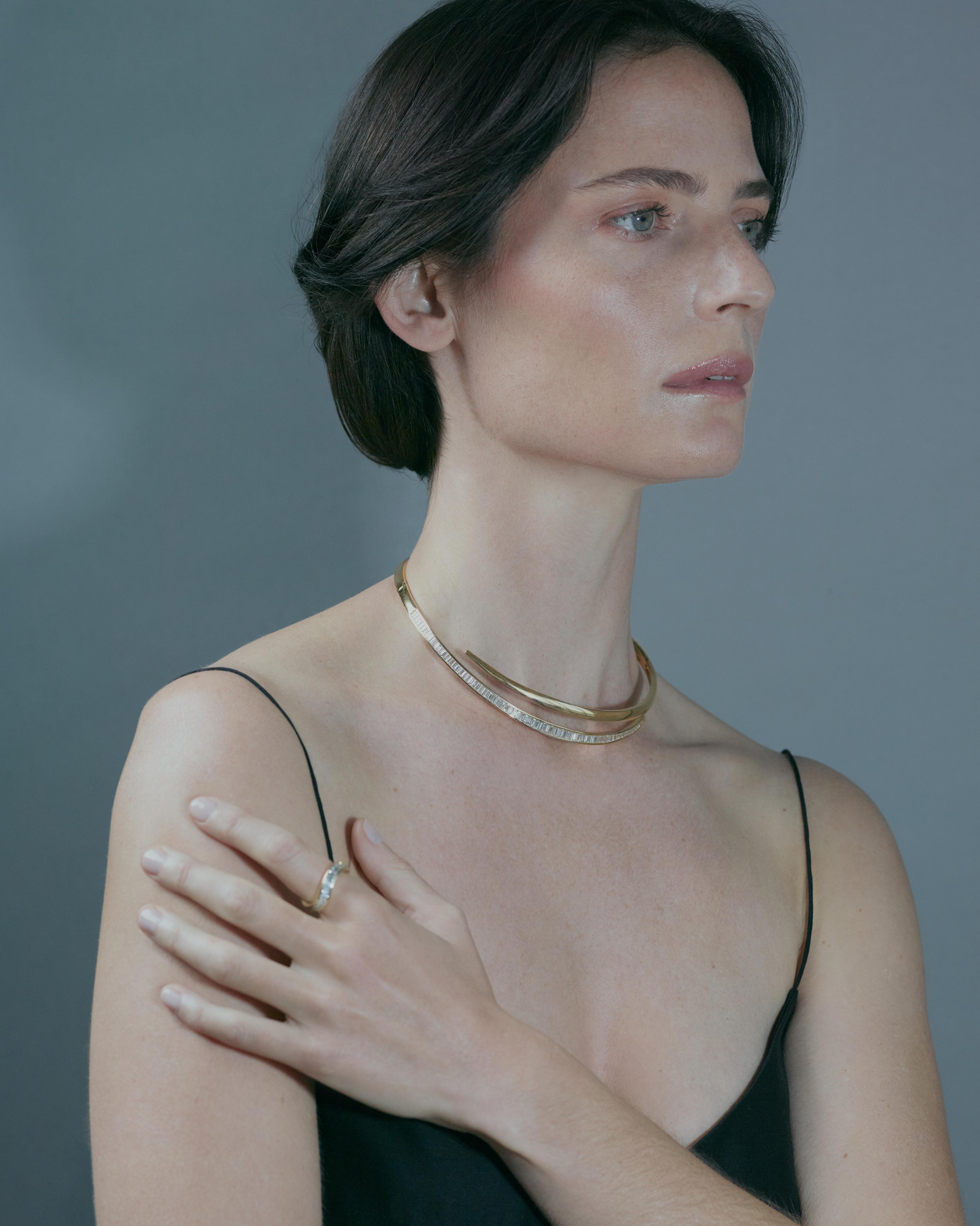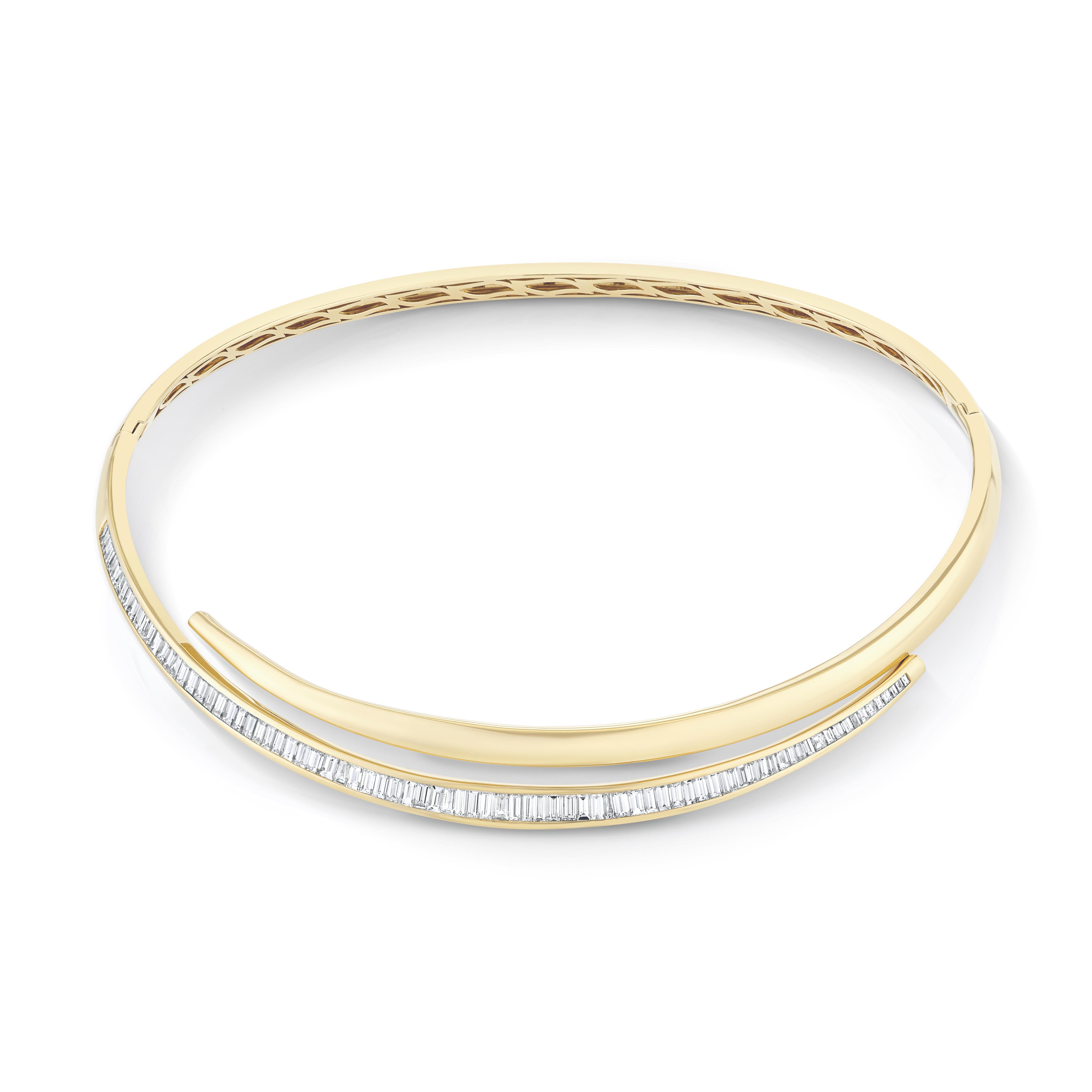 This is an elegant and contemporary open-collar, crafted from polished 18-karat gold. One side of this opening is a smooth, gleaming band of gold; the other side is a gracefully curved, slightly narrower band that is entirely illuminated by a continuous line of channel-set baguette-cut diamonds totaling 6.75 cts. These elongated, rectangular diamonds are meticulously aligned side-by-side, creating a brilliant, uninterrupted strip of sparkle. The images show the design in yellow gold, however, it can be made in white and rose gold.