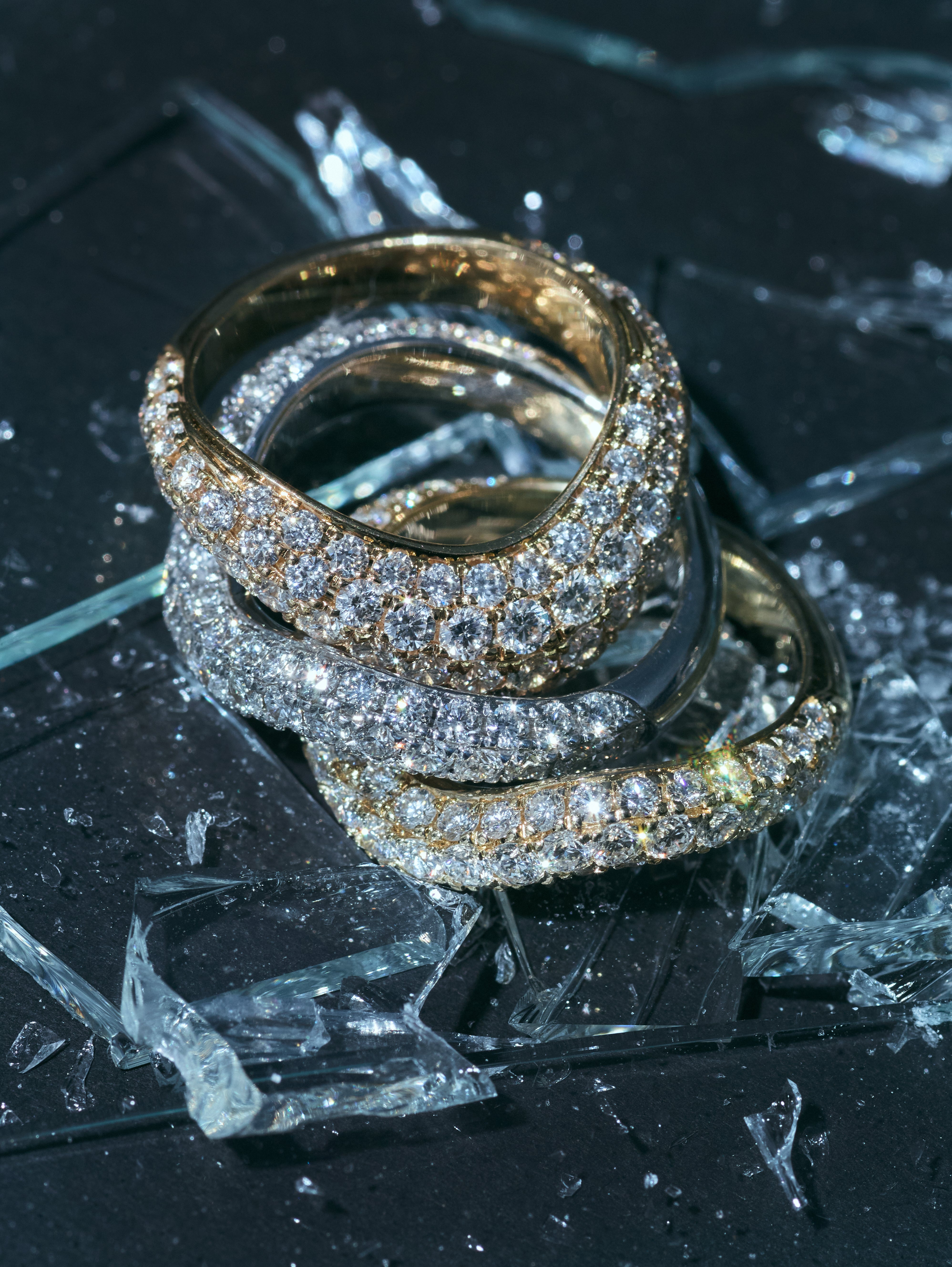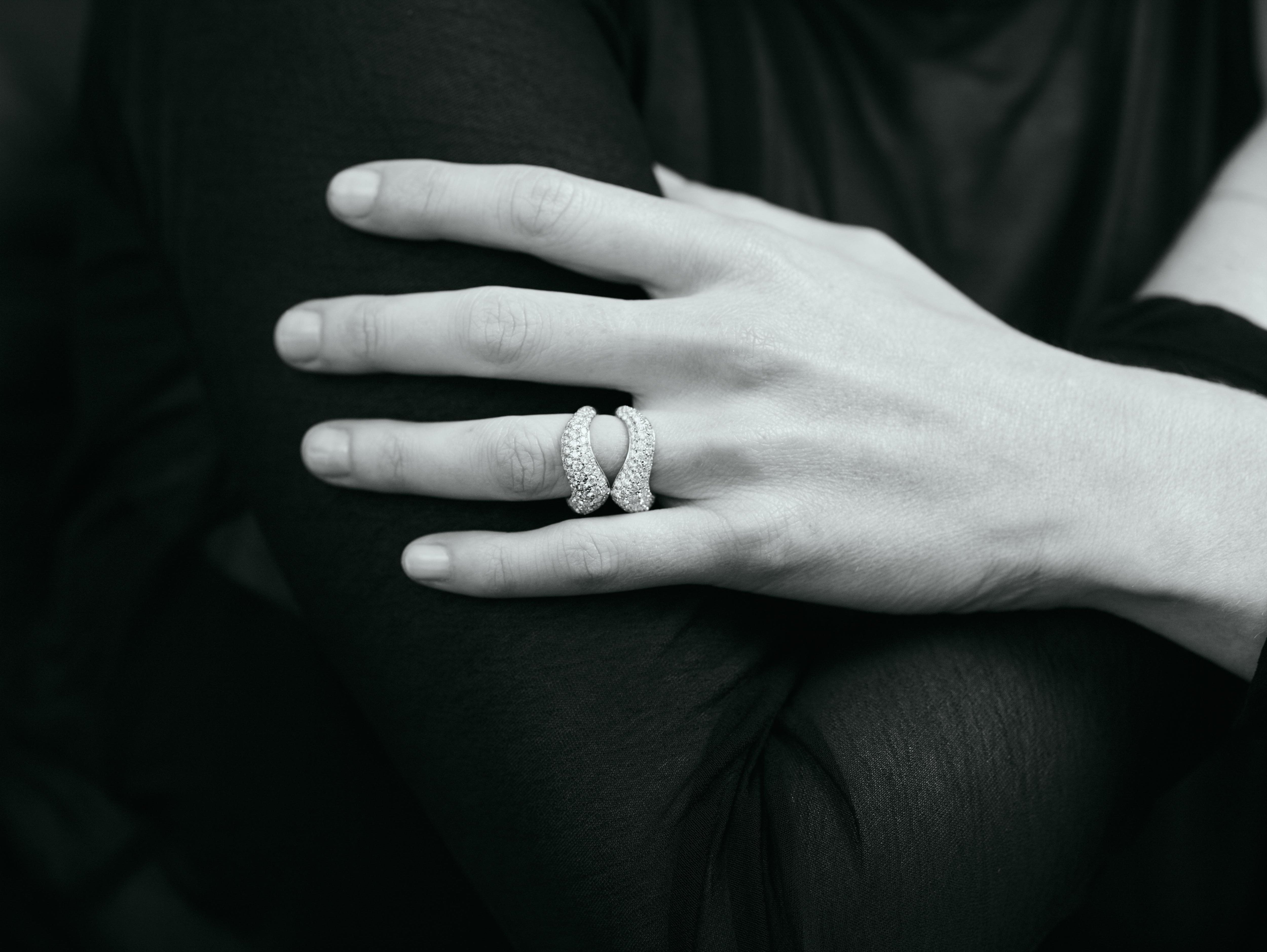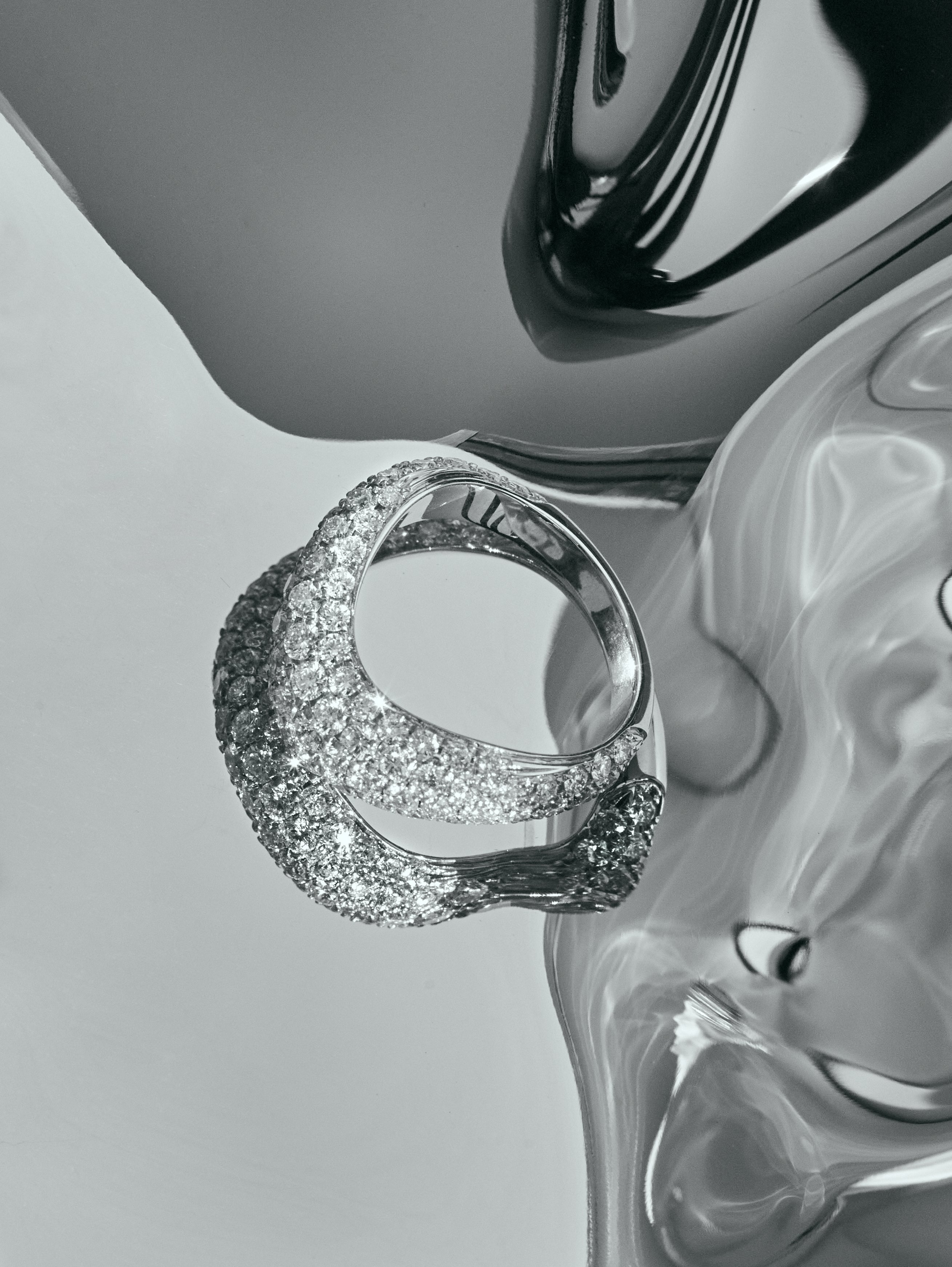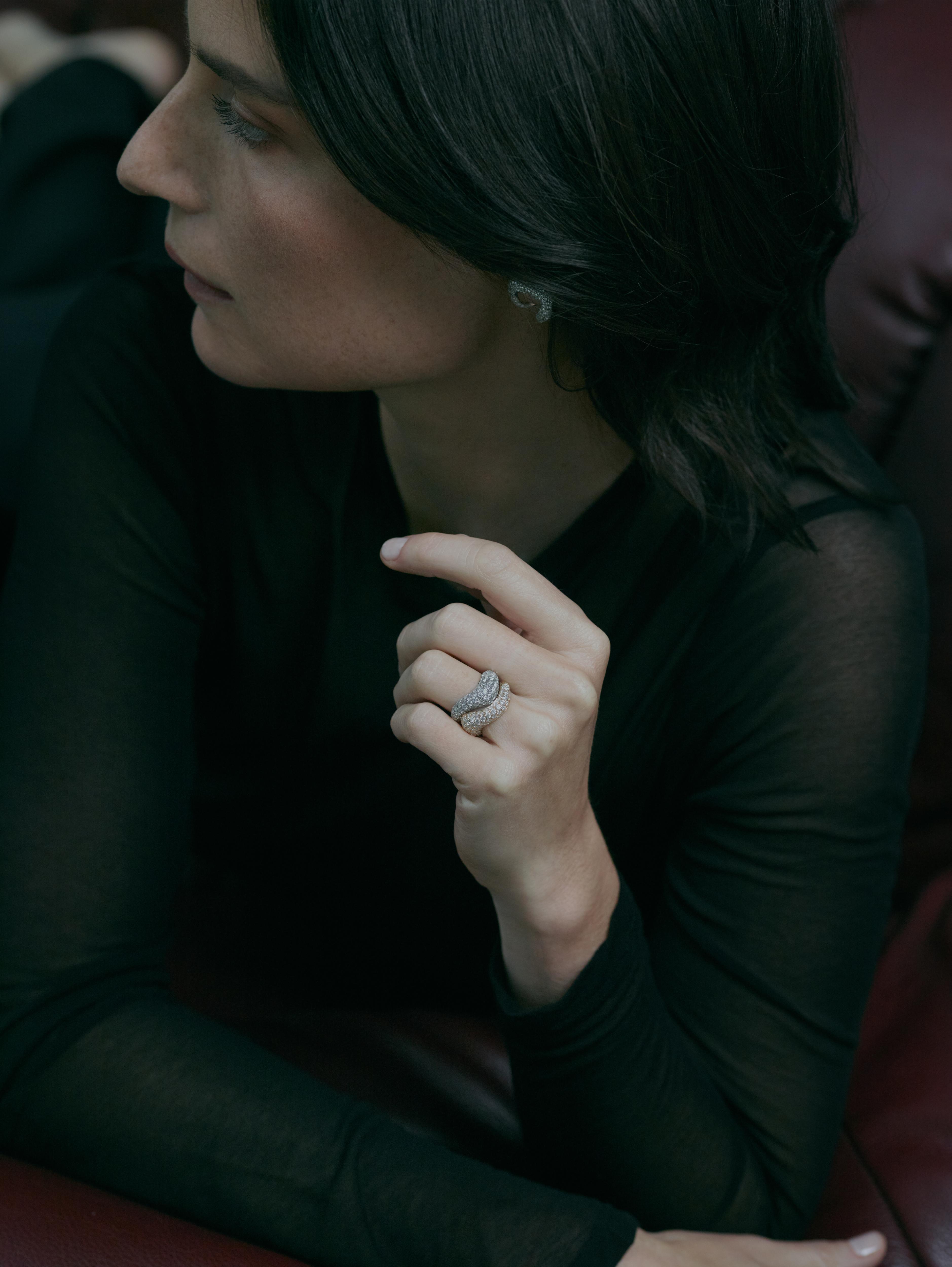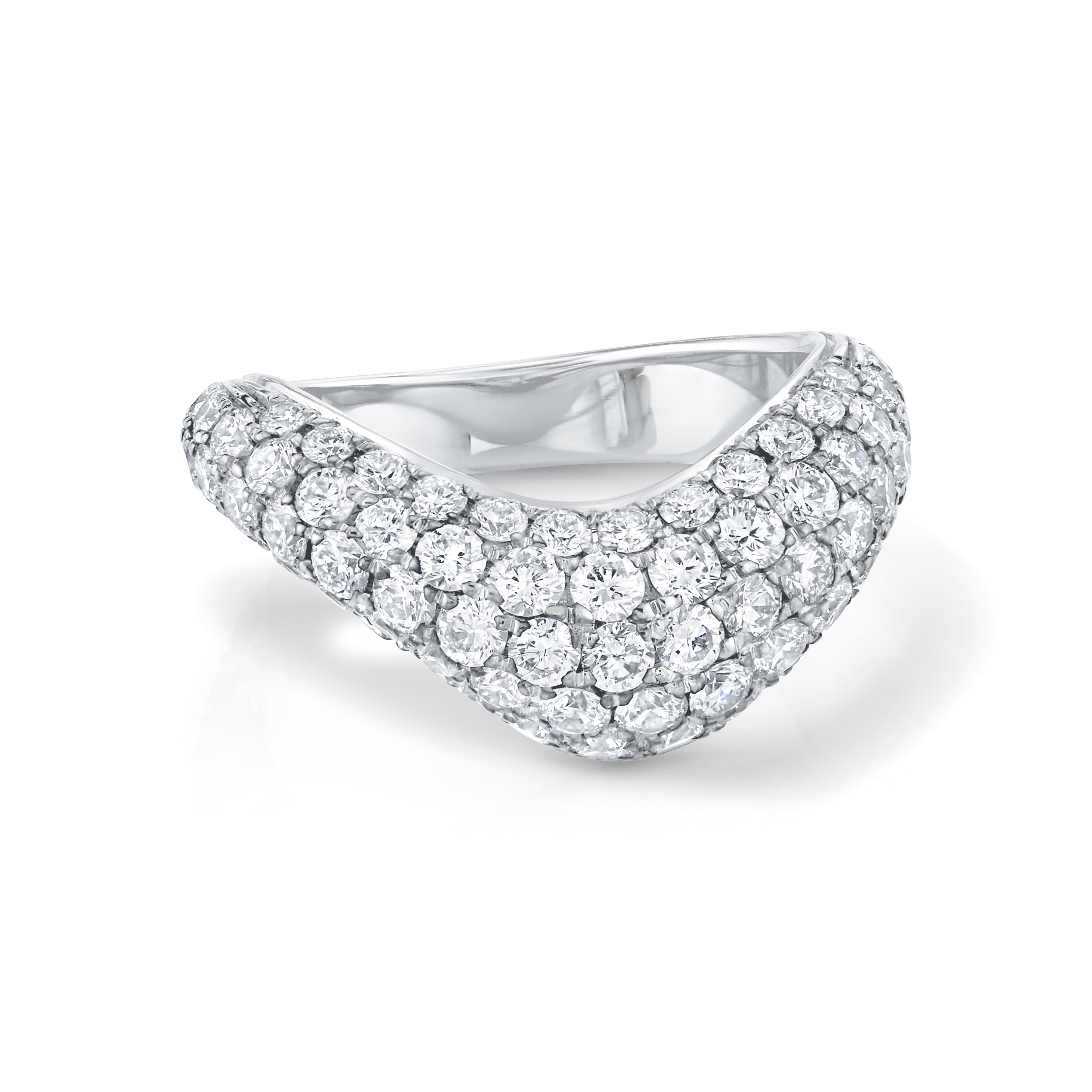 The María Collection plays with curves & volume, each diamond is carefully set under a microscope to maximize brilliance. The entire visible surface of the ring is completely covered in 2.5 cts of pave-set round brilliant-cut diamonds. These diamonds are tightly packed, creating a continuous, glittering expanse that reflects light from every angle, giving the impression of pure diamond brilliance. These rings are made to be worn in different ways - stacked, individually or upside down.