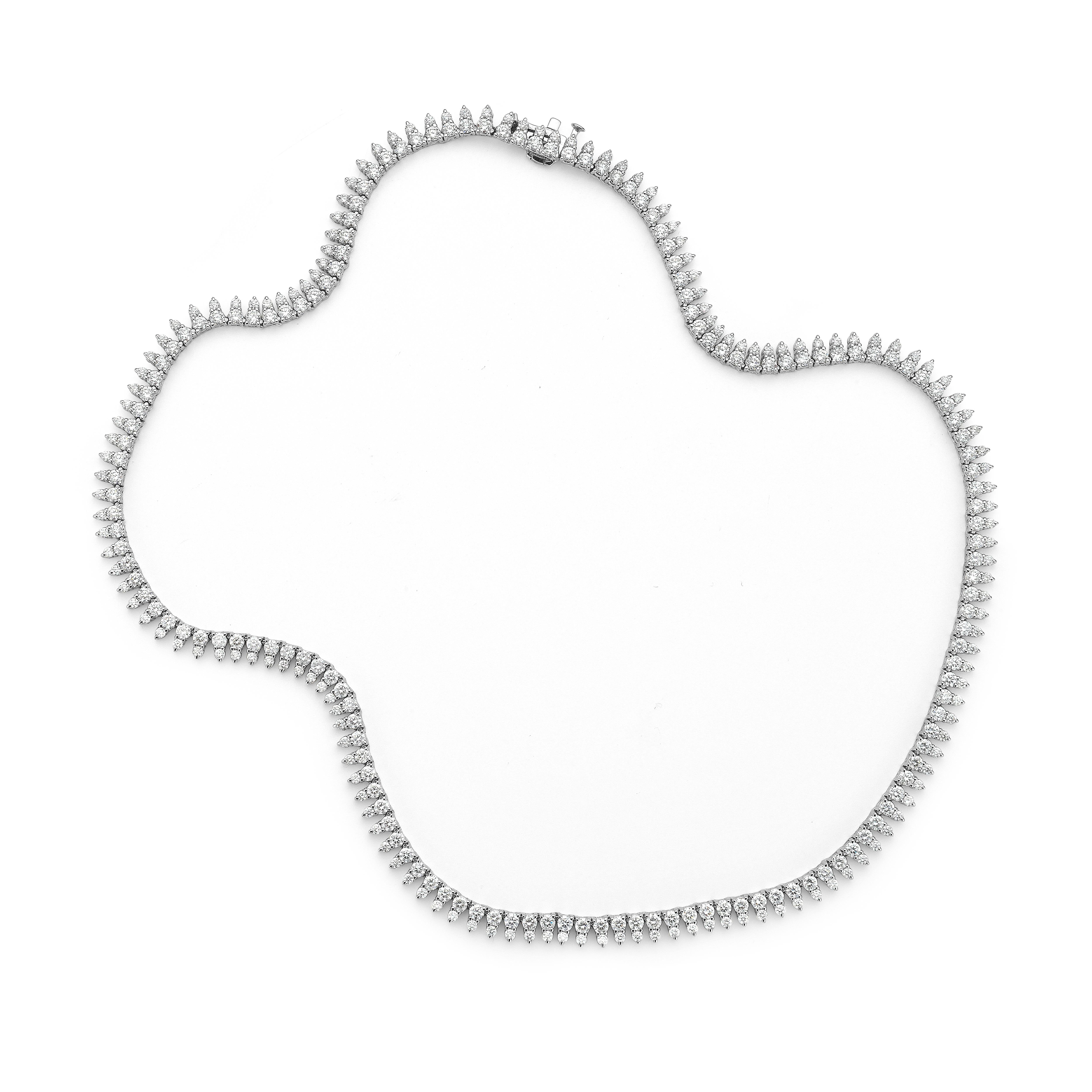 The shaker collection plays with brilliant cuts, an eccentric take on the classic tennis necklace. This 14-karat gold necklace features 9.50 cts of brilliant-cut FGVS. The image shows the necklace in white gold but this piece can be made in yellow and rose gold.